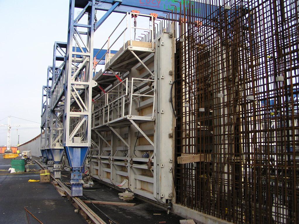 | Toch nog iets van een trein: de mobiele betonbekisting rijdt over een soort rails naar het volgende werkvak. |