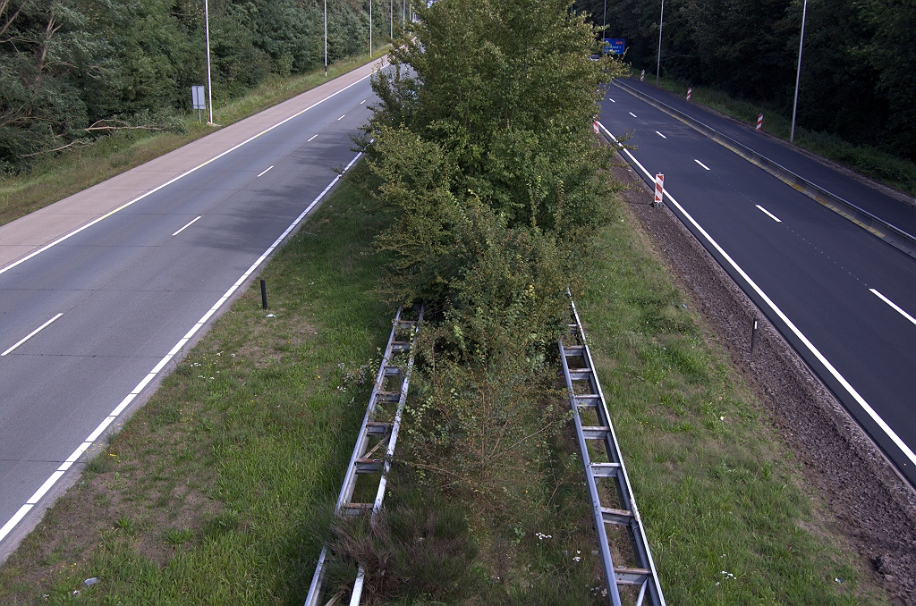 | Met de zon mee is het verschil nog wat duidelijker. V.l.n.r. de originele betonnen vluchtstrook in de HRL, twee rijstroken met de bestaande flinterdunne overlaging, en de nieuw overlaagde HRR met rijbaanbreed "stil asfalt". | |