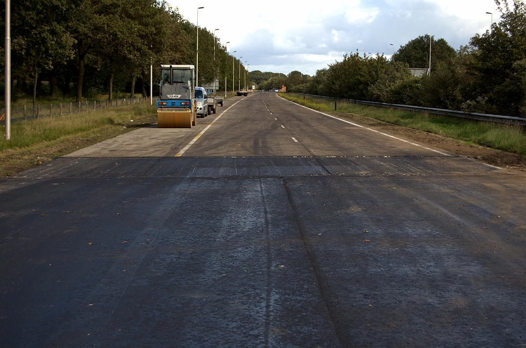 | Helaas. Overgang naar het met rust te laten restant van de betonnen rijbaan nabij km 9,5. Het beton in het werkvak is dus voorgoed aan het zicht onttrokken en we hebben niet kunnen observeren hoe het is toegetakeld voor het overlagen. | |