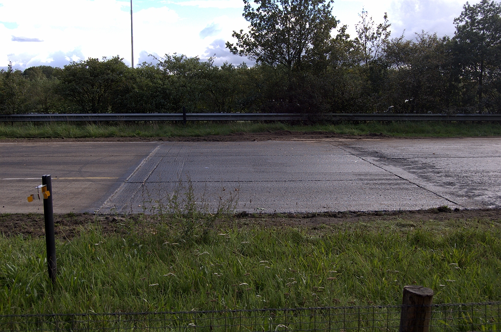 | De conclusie is dus dat er bijzonder hard is gewerkt. Een wekelijks bezoek is te weinig om alle facetten van het project mee te maken. Dan maar wat detailfoto's van de beton/asfalt overgang. Rechts het begin van de DAB overlaging. Links daarvan is een dunne laag van het beton weggefreesd. Kennelijk wordt hier de geluidreducerende toplaag direct op het beton aangebracht. | |