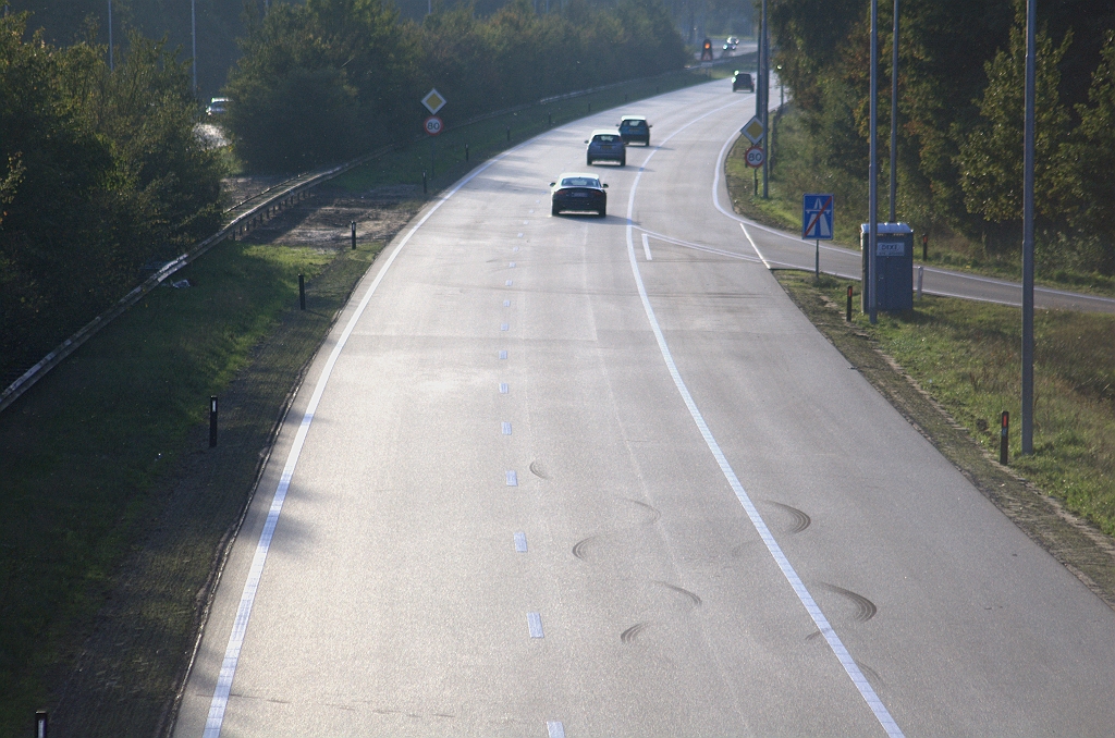 | Problematische tegenlicht foto van de A270 HRL tussen het viaduct Geldropsedijk in Nuenen en de Wolvendijk in Eindhoven. Een ervaringsdeskundige die het vers overlaagde wegvak heeft bereden meldde dan ook dan ook dat de weg optisch zo glad is, dat men het idee heeft dat er van slipgevaar sprake is. | |