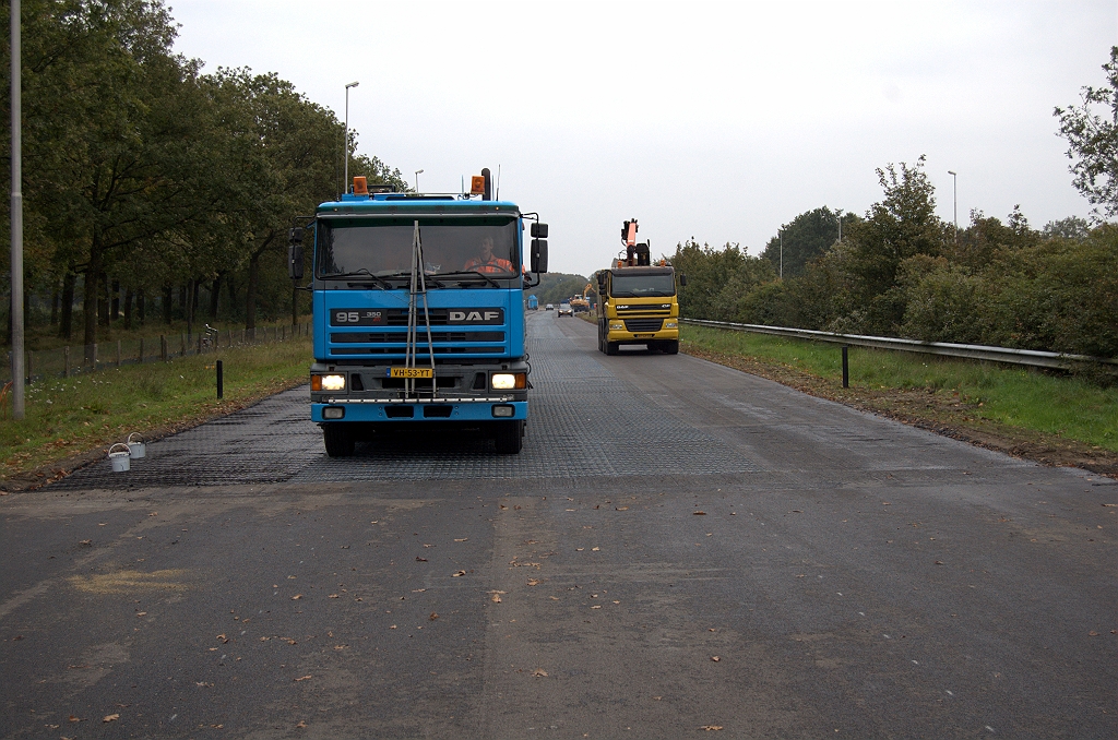 Er wordt gewerkt op een zondag. Bij navraag werd verklaard dat men het door de week zo druk heeft dat er moet worden overgewerkt in het weekend. Blauw voertuig rijdt stapvoets over het werkvak...