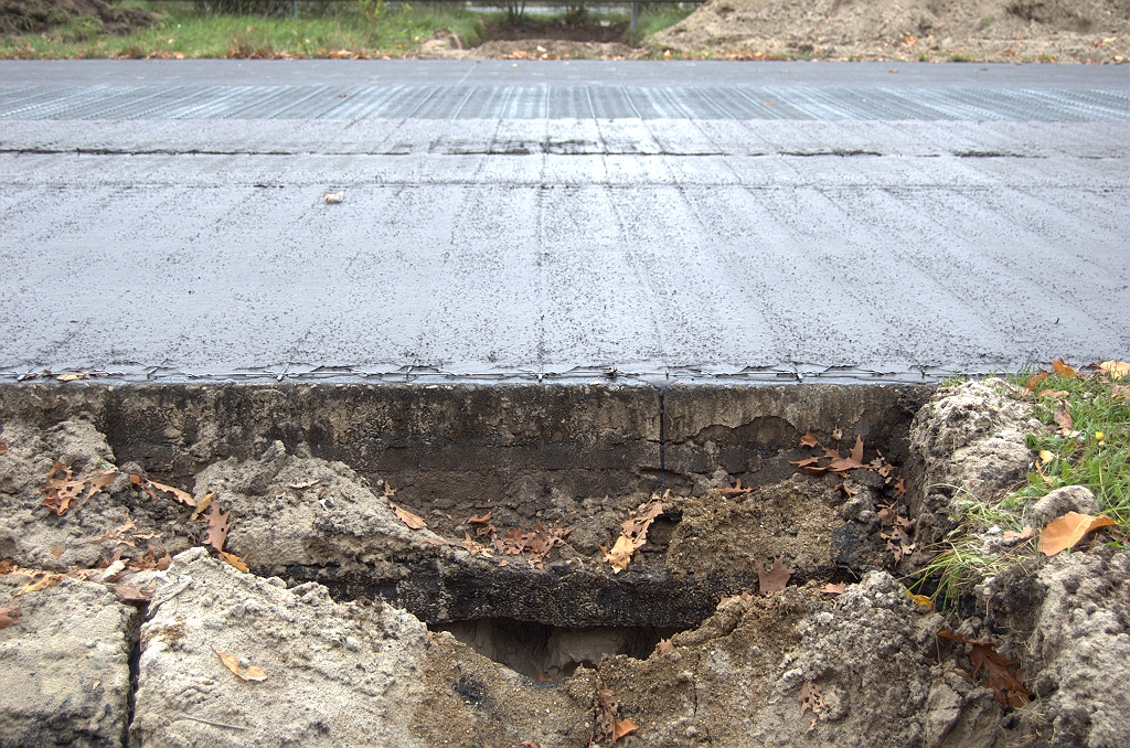 Bij een ontgraving voor kabels wordt ons nog een blik gegund op de originele constructie van de bijna 40 jaar oude rijbaan. Het lijkt erop dat de betonplaten op een asfaltlaag zijn neergelegd.