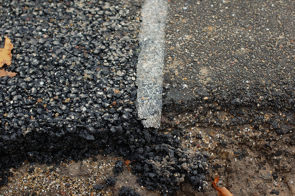 | Hm, wat is het nu? Het lijkt nog het meest op de grofkorrelige onderlaag in een dubbellaags ZOAB constructie, maar de fijnkorrelige toplaag gaat er duidelijk niet komen, te zien aan de gladde overgang naar de provinciale overlaging. | |