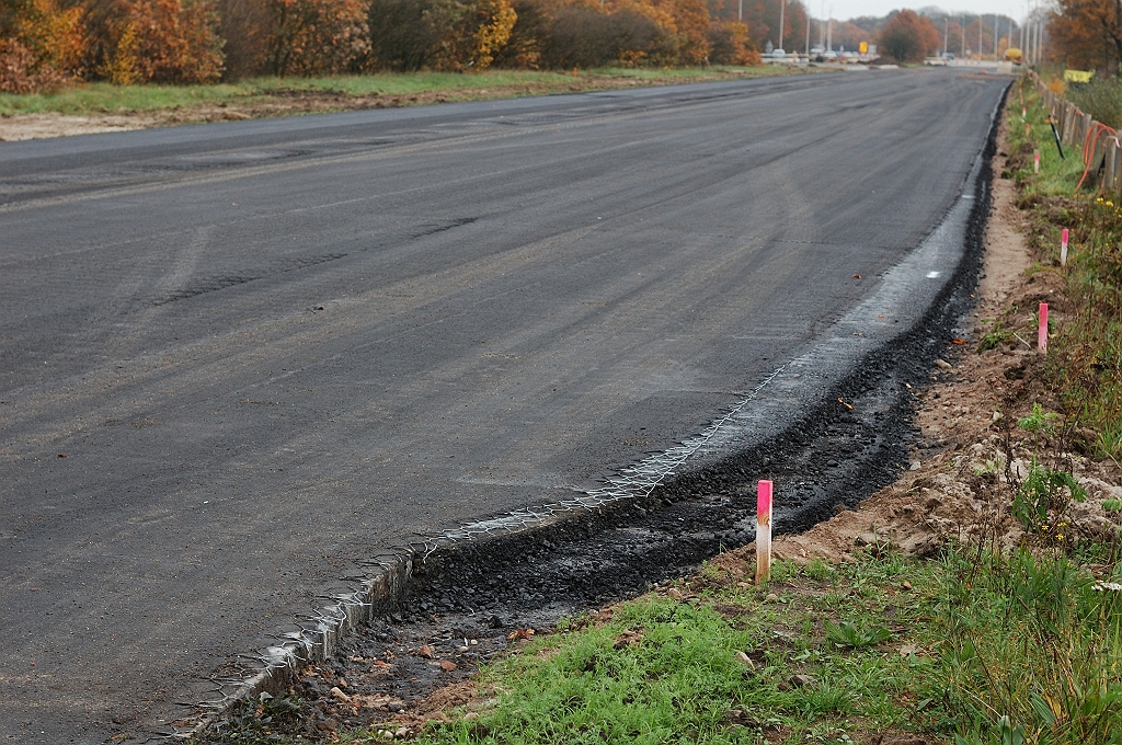| De op te geven vluchtstrook is kennelijk niet breed genoeg voor de aan te leggen "rechtsaf" opstelstrook, zodat er een strook asfalt naast de oude betonnen rijbaan is toegevoegd. Ook over het verbreedseltje wordt asfaltwapening aangebracht. | |