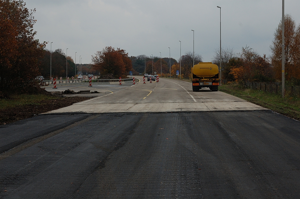 | Overgang van de ongelijkvloerse kruising naar de voorlopig met rust te laten laatste kilometer betonnen rijbaan naar Helmond. Het wordt dus een stukje "gewone" buiten bebouwde kom weg met een Vmax van 80 of 70, ondanks het autosnelwegbeeld. | |