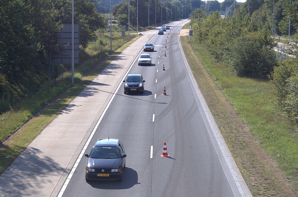 | Na dit weekend af te sluiten HRR zodat kan worden begonnen met de overlaging. Die wordt naar verluidt 12,5 cm dik, maar over de samenstelling weten we niets. Linkerrijsttrook afgezet, en zo te zien is men al begonnen met het wegfrezen van de linkerkantlijn. | |