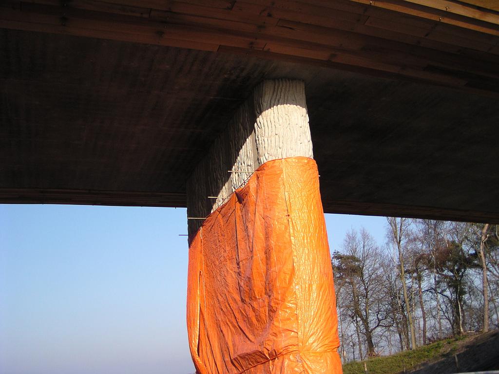 | De pilaar met boomschors motief onder het viaduct met de Schansbaan werd reeds met grafiti besmeurd. Het inpakken met plastic zeil komt dan ook enigzins als mosterd na de maaltijd. Wat die draadeinden boven het plastic doen is niet duidelijk. |