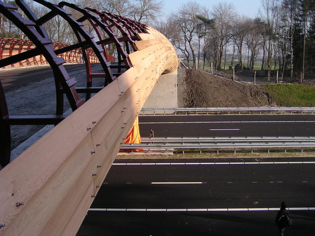 | Schansbaan viaduct wordt bekleed met dunne houten latjes. "Gamma" liet Jeroen zich ontvallen. |