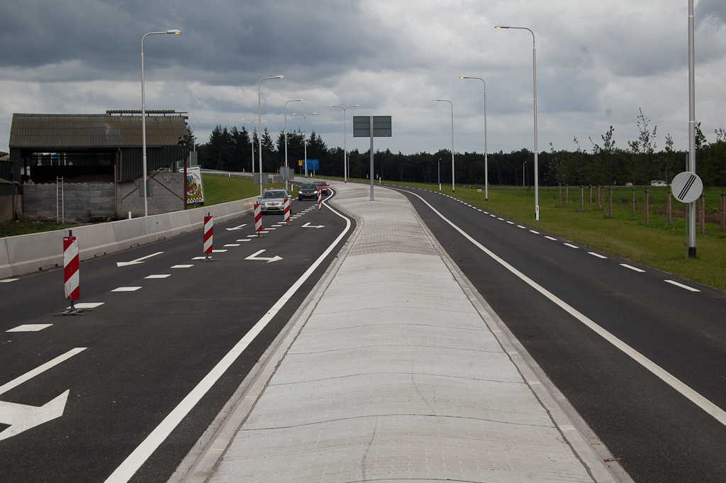 Aankomst N284 vanaf talud aansluiting A67 naar de kruising met de Eerselsedijk. Betonnen barrier blokkeert gedeeltelijk de uitvoegstrook naar het Kempisch bedrijvenpark-oost.